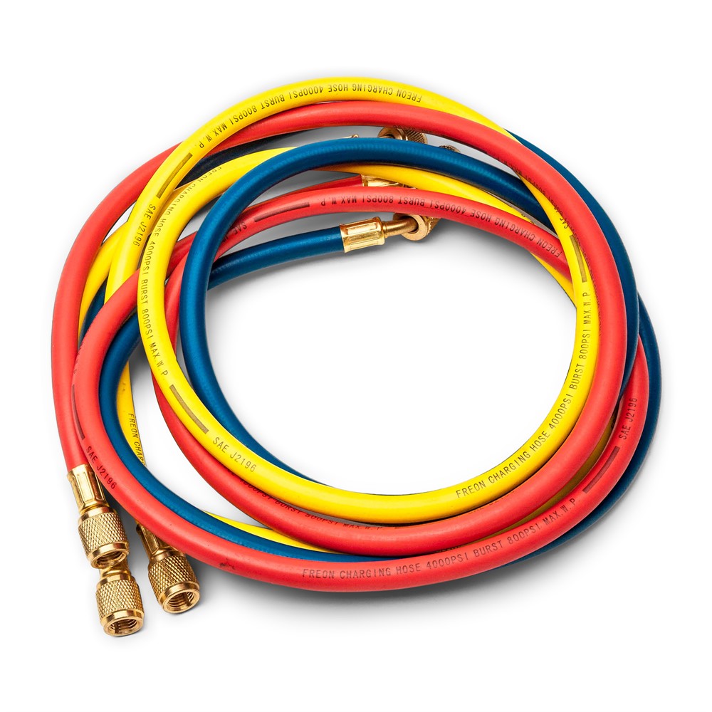 En blå slang, en gul slang och en röd slang - alla är 150 cm lång med olika dimensioner och anslutningar på båda ändarna.